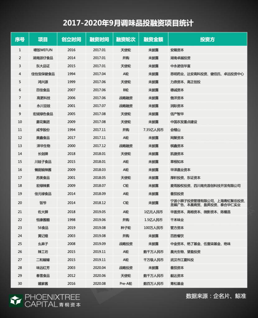 有個特別的現(xiàn)象,調(diào)味品玩家數(shù)量龐大,資本關(guān)注度亦高,但最終投資的項目量并不多。這主要因為符合機構(gòu)投資邏輯的標(biāo)的有限,資本看調(diào)味品項目,重點會考量渠道、供應(yīng)鏈能力。