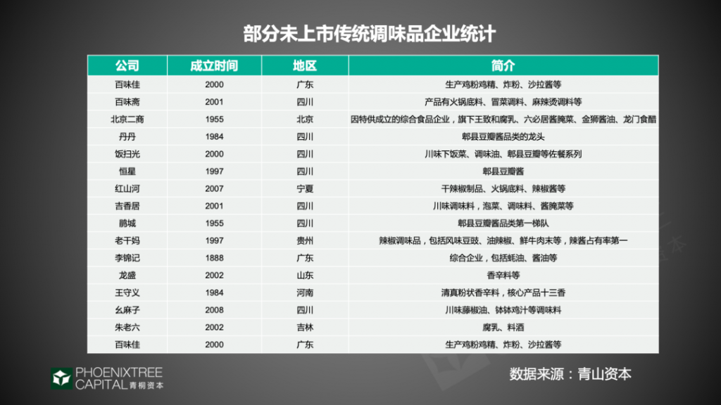 其中,未上市傳統(tǒng)調(diào)味品企業(yè)也是賽道重要玩家,主要呈現(xiàn)2大特點:1)普遍體量大,已成為細(xì)分品類的頭部。來自公司官方數(shù)據(jù),辣椒醬龍頭老干媽,2019年銷售收入破50億元,同比上漲14.43%;香辛料龍頭王守義,2019年營收超30億元。2)品類上,川貴地區(qū)的辣椒調(diào)味品居多,如老干媽、百味齋、丹丹、飯掃光、恒星等。由于良好的現(xiàn)金流,經(jīng)營理念偏傳統(tǒng),這類企業(yè)融資需求往往并不強烈。
