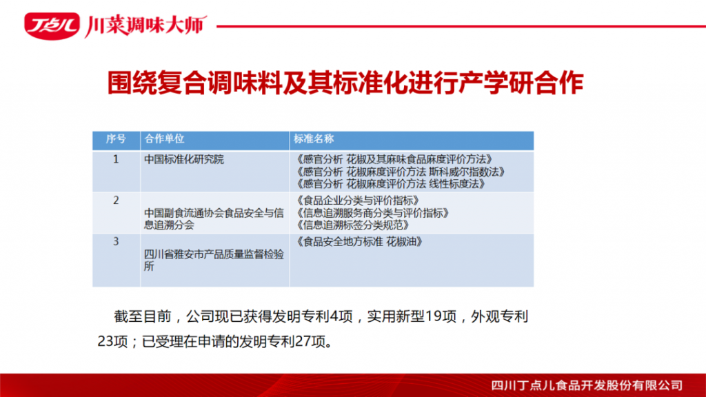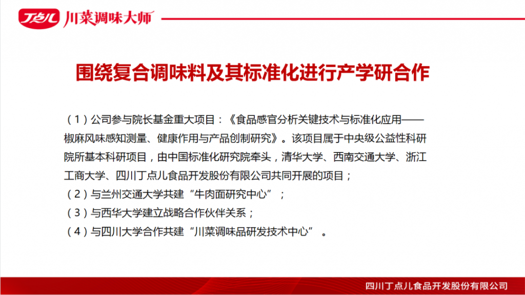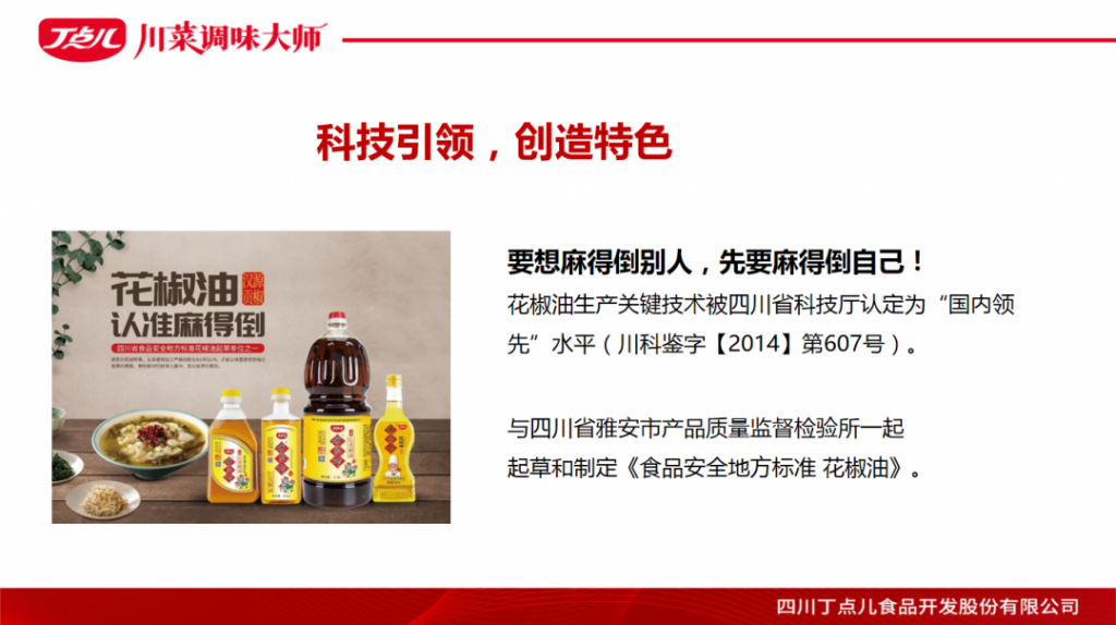 ? ? ? 以“豐富生活點點滋味”為理念,丁點兒股份致力于推動川菜調味標準化、川菜菜品工業(yè)化的發(fā)展,為餐飲客戶提供安全、便捷的調味標準化產品,簡化川菜烹飪流程,讓川菜烹調變簡單!