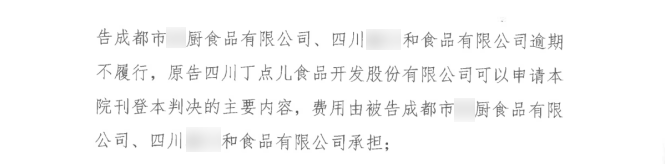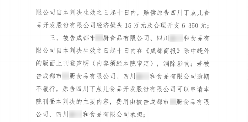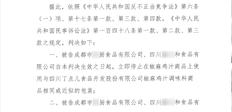 ? ? ? ?2020年11月30日,成都市中級人民法院一審判決丁點兒股份訴成都市某廚食品有限公司、四川某和食品有限公司不正當(dāng)競爭維權(quán)案勝訴。