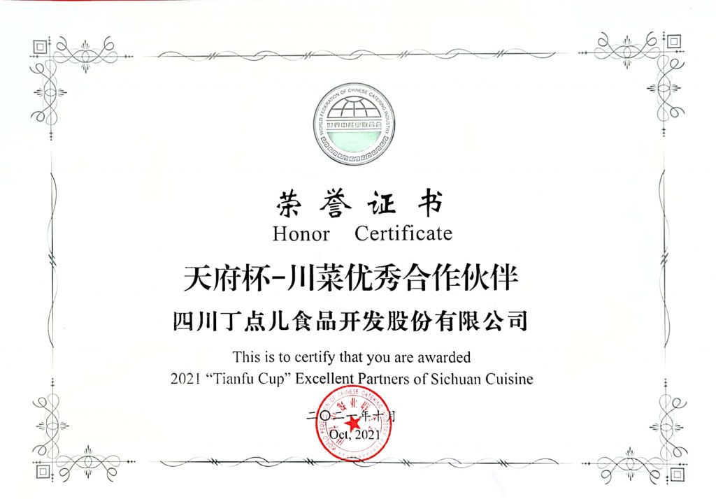 ? ? ? ?10月18-20日,由成都市郫都區(qū)人民政府、世界中餐業(yè)聯(lián)合會共同主辦的第四屆世界川菜大會在成都市郫都區(qū)隆重召開,丁點(diǎn)兒股份攜企業(yè)明星產(chǎn)品在會場亮相,并在2021“天府杯”世界川菜頒獎大會中獲得“‘天府杯’川菜優(yōu)秀合作伙伴”稱號。