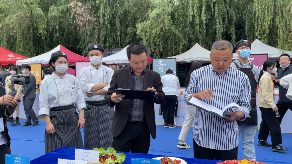 ? ? ? ?接下來是各位學子翹首以盼的決賽環(huán)節(jié),比賽場上,各位參賽選手紛紛拿出看家本領(lǐng),在烹飪技能方面一展風采。這無疑是一場舌尖上的較量,參賽選手們用心操作,精心設(shè)計,各色菜肴設(shè)計獨特,色相味型俱佳。學校優(yōu)秀專業(yè)教師評委與丁點兒股份技術(shù)中心產(chǎn)品應用培訓部副部長陳證宇共同為選手們的菜品點評、打分。