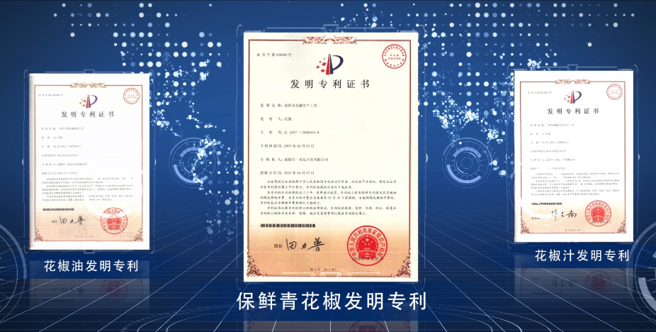 丁點兒股份不斷開發(fā)新技術、改進新工藝,先后獲得包括青花椒保鮮、鮮花椒油生產(chǎn)工藝、花椒提取物苦味去除技術、花椒提露、干制方法及裝置、青花椒汁及其生產(chǎn)工藝多項發(fā)明專利,多項技術屬行業(yè)領先。