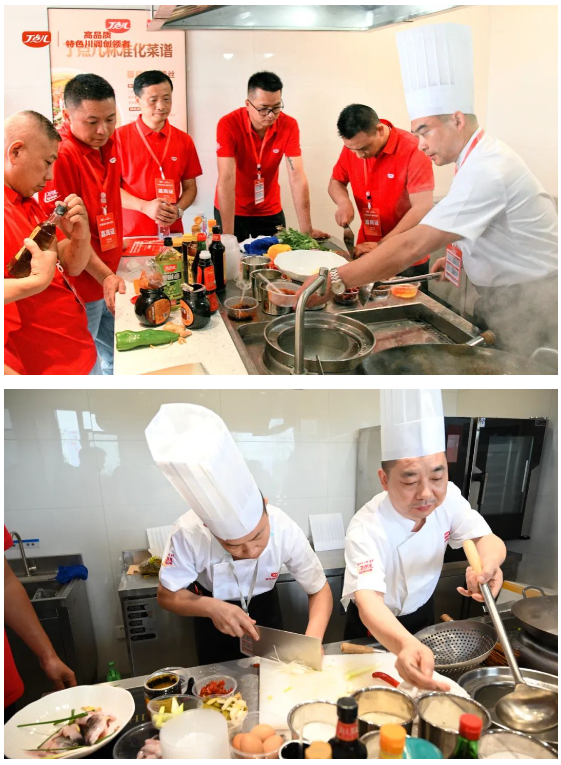 為進(jìn)一步加強(qiáng)菜品應(yīng)用,大家分組開(kāi)展了盲盒食材挑戰(zhàn),現(xiàn)場(chǎng)進(jìn)行菜品制作。大廚們分工有序、緊密配合,用丁點(diǎn)兒干鍋醬、藤椒油、金湯酸菜醬、椒麻雞汁等產(chǎn)品快速烹制出一道道色香味俱全的精美菜品!