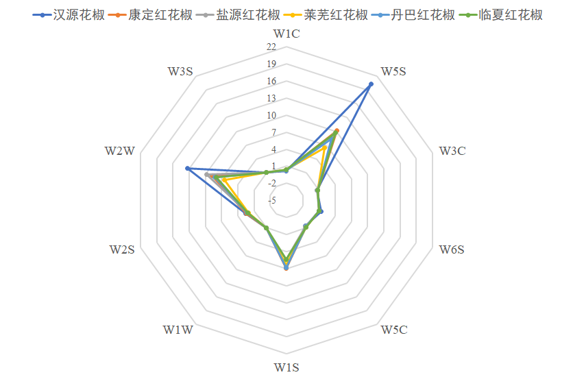 電子鼻技術(shù)設備簡單,容易攜帶,操作簡便,是較成熟的風味分析技術(shù),在食品分析中應用廣泛。劉振平博士運用電子鼻技術(shù)對漢源花椒及與漢源花椒外觀顏色、顆粒大小類似,從表面難以區(qū)分且常用于冒充或摻假的不同產(chǎn)地的紅花椒進行了10個傳感器通道的風味成分測定和分析(圖1),用于漢源花椒的鑒別。