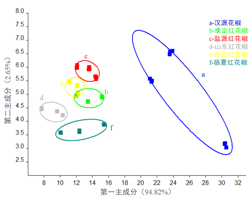 圖2:電子鼻傳感器對不同產(chǎn)地紅花椒響應數(shù)據(jù)的PCA 得分圖