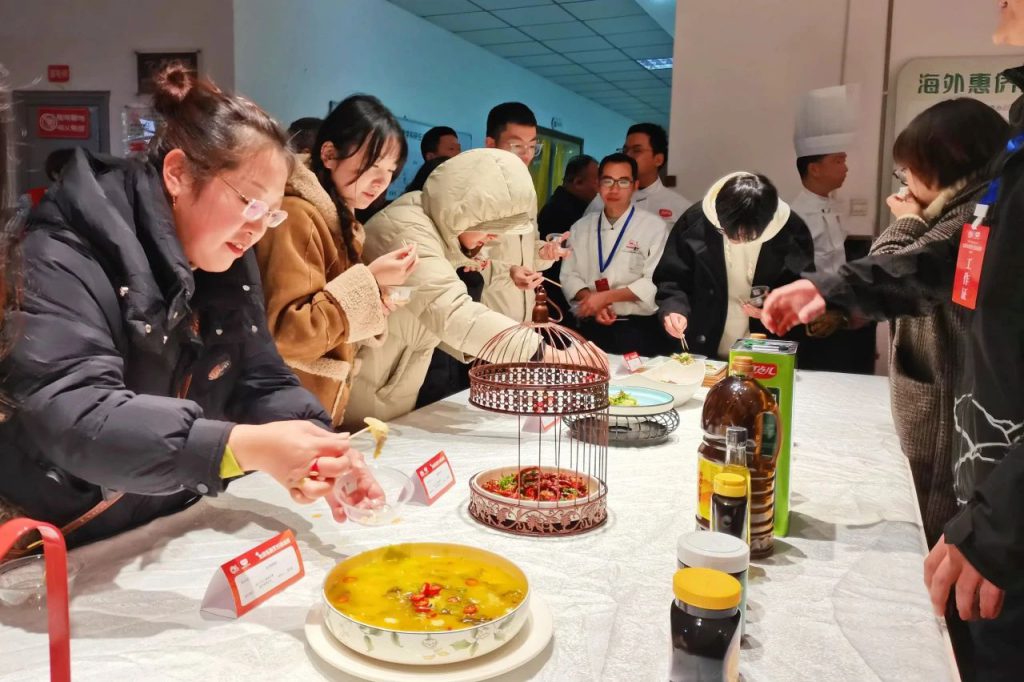 獨特的風(fēng)味、卓越的品質(zhì),丁點兒高品質(zhì)特色川調(diào)產(chǎn)品吸引了眾多參賽選手及現(xiàn)場嘉賓的目光。以其烹飪的干鍋醬香掌中寶、青椒毛血旺、金湯酸菜魚片等菜品更是香飄四溢,一上桌就被品鑒一空。“太好吃了,不夠吃,不盡興!”四川旅游學(xué)院一位志愿者同學(xué)說。