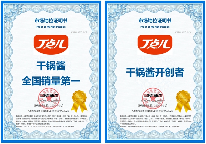 尚普咨詢集團是中國最早成立的專業(yè)市場研究公司之一。其通過行業(yè)專家和企業(yè)調(diào)研,對比中國大陸(含22個省、5個自治區(qū)、4個直轄市)范圍內(nèi),全渠道市場、各干鍋醬產(chǎn)品上市時間與創(chuàng)新情況,從我國干鍋醬行業(yè)起源統(tǒng)計至2024年12月31日,得出丁點兒為“干鍋醬開創(chuàng)者”的認證。同時根據(jù)全渠道市場,統(tǒng)計了2024年1月1日至2024年12月31日各干鍋醬品牌相關產(chǎn)品銷量情況,得出丁點兒“干鍋醬全國銷量第一”的認證。