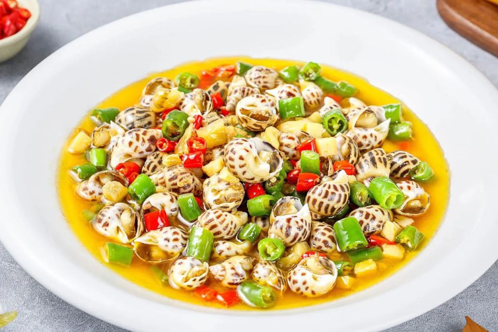(1)花螺洗凈,二荊條、小米辣切丁,泡野山椒、姜切粒,大蔥切段備用;