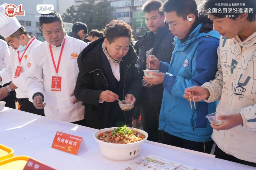丁點(diǎn)兒菜品研發(fā)工程師更是現(xiàn)場(chǎng)操作——以干鍋醬烹制天府熗鍋魚(yú)、用泡椒醬打造泡椒鮮鍋雞……香氣四溢的菜品引得圍觀者紛紛試吃,贊不絕口!有選手邊品嘗邊豎起大拇指:“這魚(yú)外酥里嫩,醬香透骨,回家我就用丁點(diǎn)兒干鍋醬試試!”