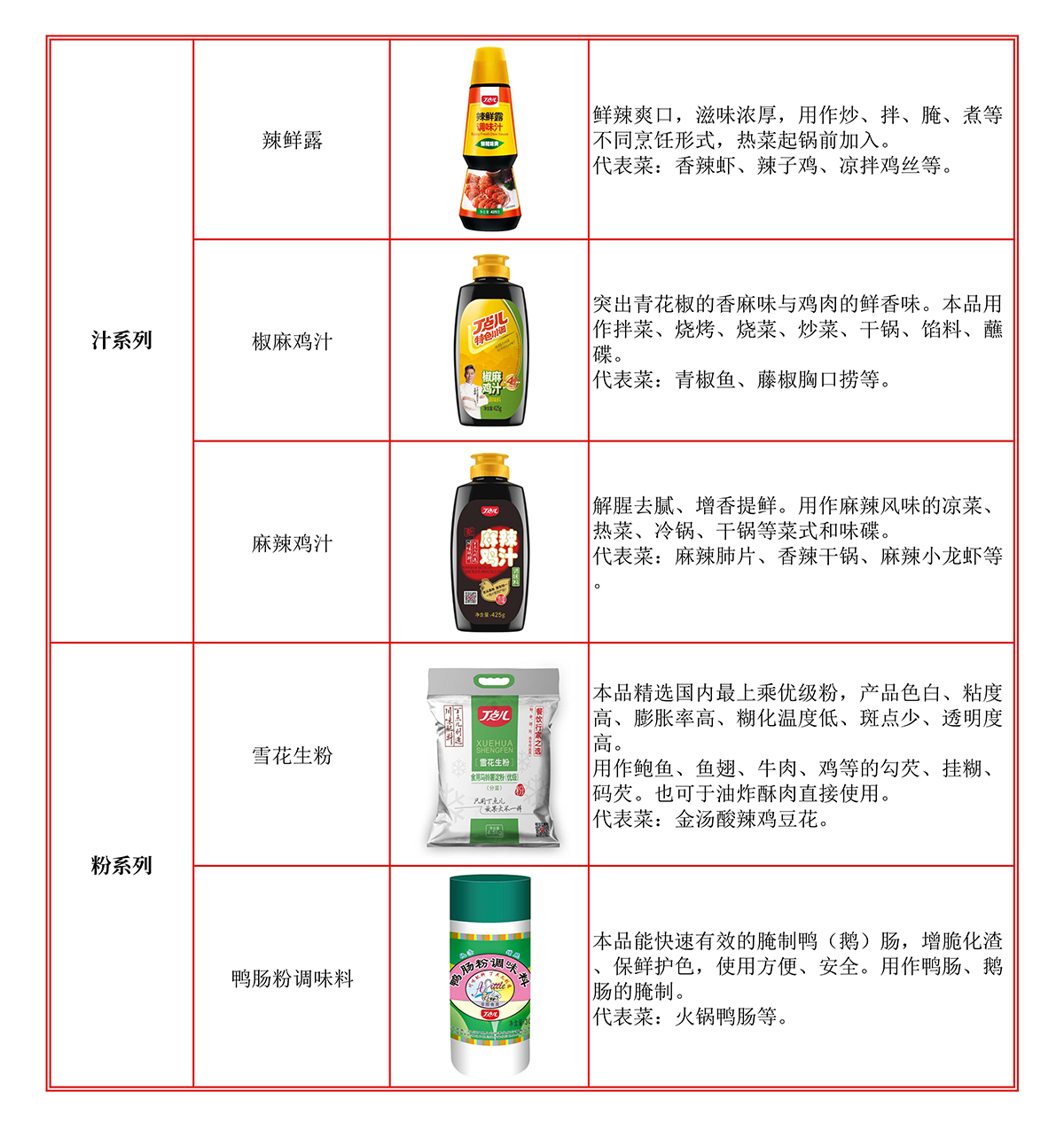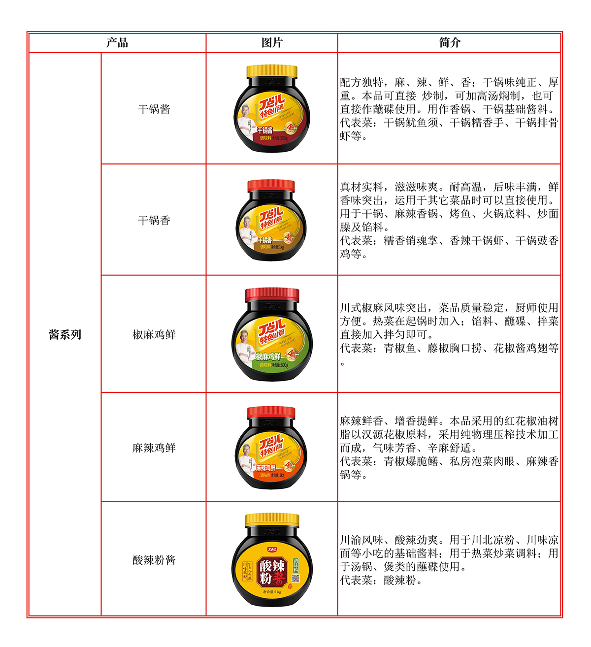 公司主要面向餐飲企業(yè)提供標(biāo)準(zhǔn)化、便捷化的川味特色調(diào)味料,主要有川味復(fù)合調(diào)味料、川味特色花椒油兩大類產(chǎn)品。川味復(fù)合調(diào)味料按形態(tài)劃分主要有醬、汁、粉、油四種形態(tài);按口味劃分,圍繞川菜“麻”“辣”“香”的特點,主要有椒麻、麻辣、酸辣、鮮香等多種口味,共計200余種產(chǎn)品。川味特色花椒油主要有漢源紅花椒油、藤椒油等產(chǎn)品。主要產(chǎn)品如下: