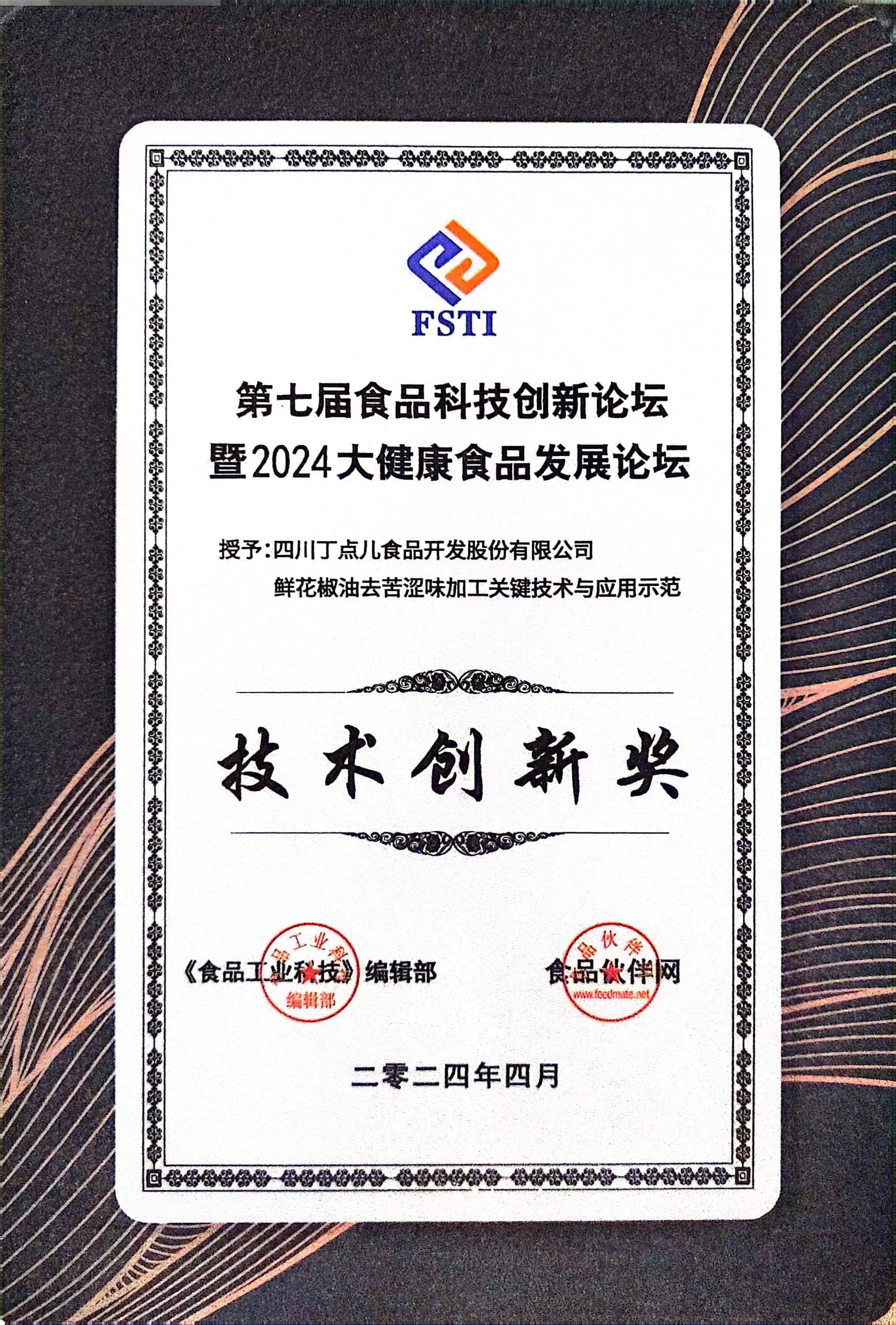 喜報!丁點兒食品“鮮花椒油去苦澀味關(guān)鍵技術(shù)”獲“技術(shù)創(chuàng)新獎”!