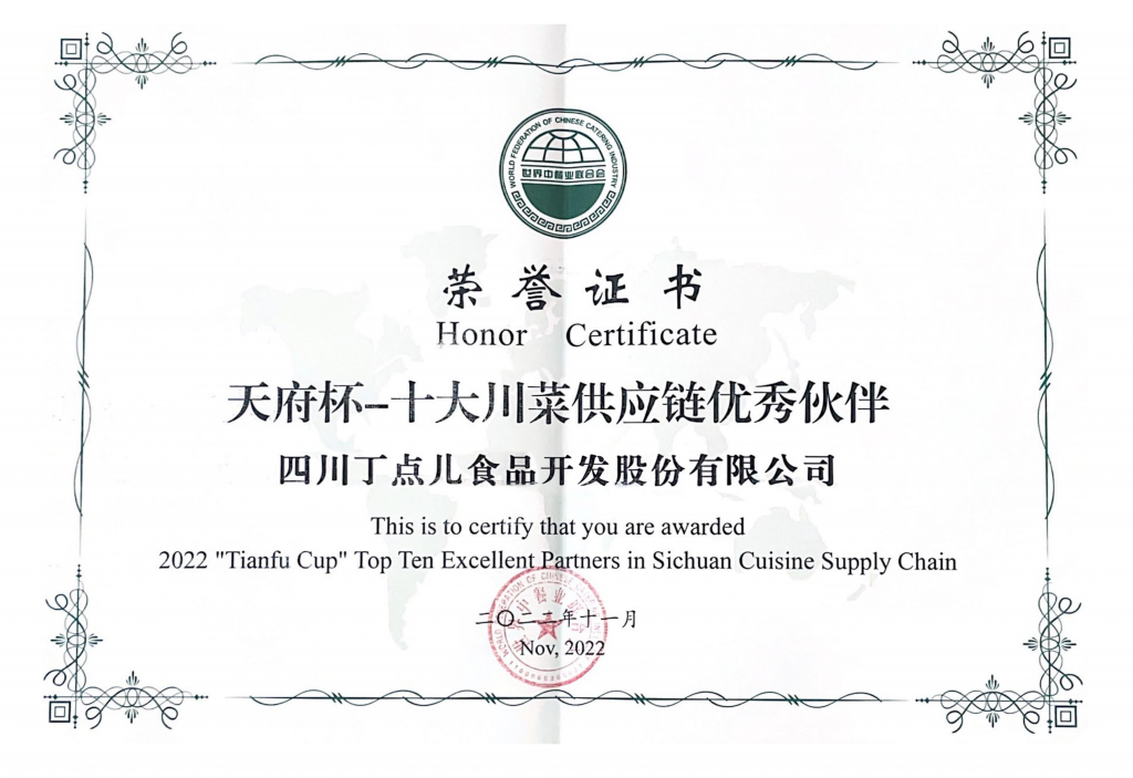 丁點兒股份深耕川調(diào)領(lǐng)域20余年,始終致力于推動川菜調(diào)味標準化發(fā)展和川菜飲食文化傳承與創(chuàng)新,努力為川菜產(chǎn)業(yè)高質(zhì)量可持續(xù)發(fā)展提供有力支撐,本次大會榮獲2022“天府杯”十大川菜供應(yīng)鏈優(yōu)秀伙伴獎。